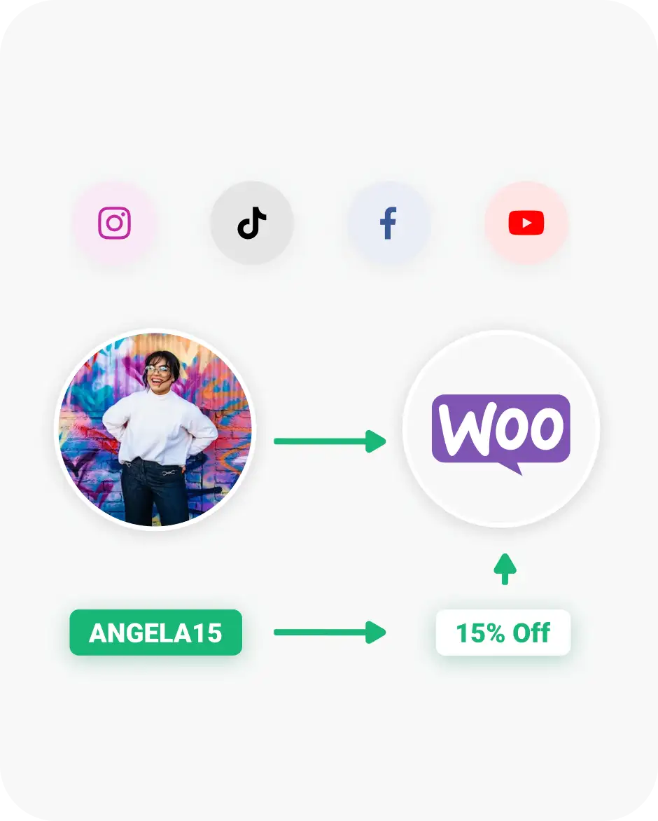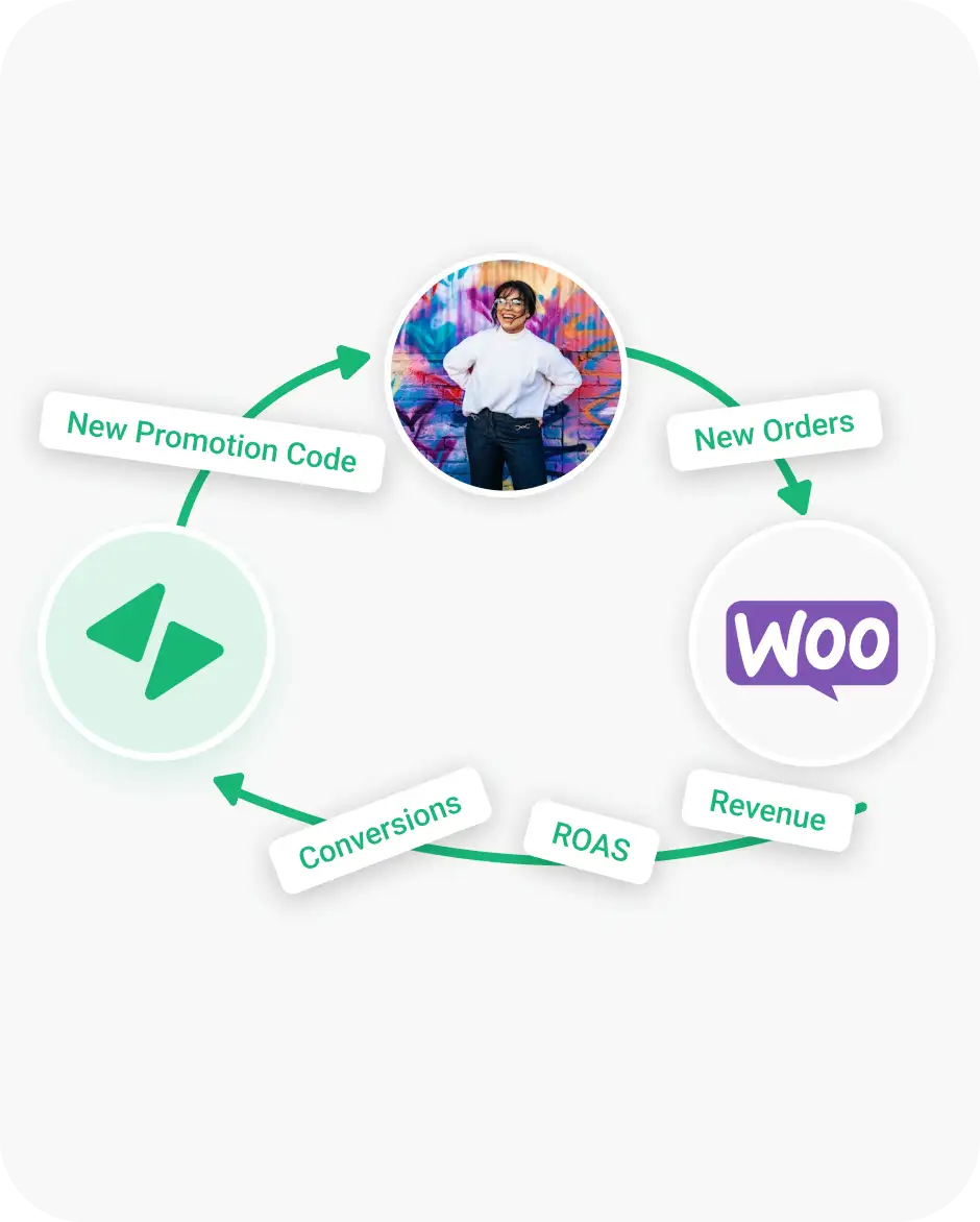 Scale your influencer marketing: Share discount codes with creators and track performance - everything automatically synchronized with WooCommerce.
